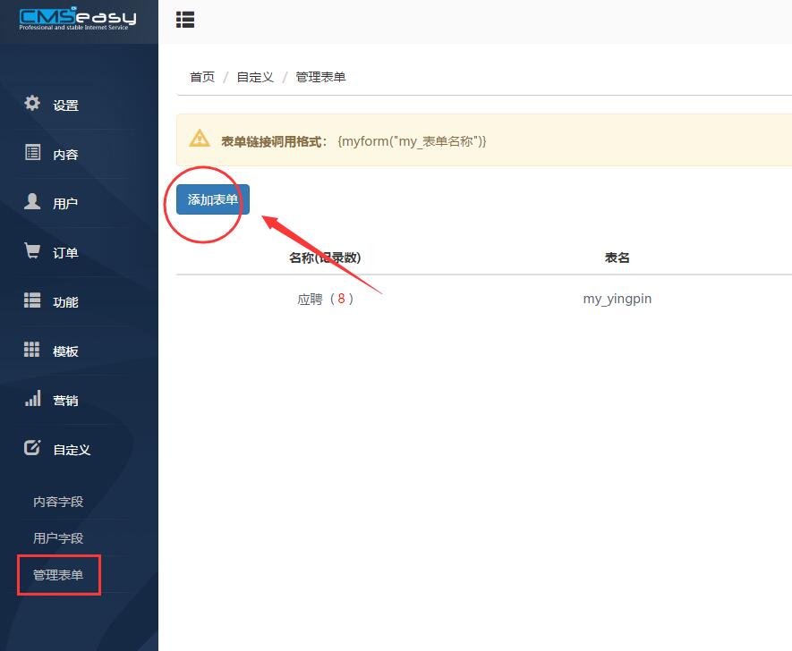 首先登錄網(wǎng)站后臺,在左側(cè)找到 [ 自定義 ] - [ 表單管理 ] - 在表單列表點擊 [ 添加表單 ] 按鈕,可參考圖中內(nèi)容設(shè)置,如圖: