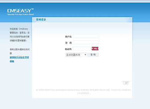 | 1、在瀏覽器地址欄中輸入如 http://域名/admin后回車,將出現(xiàn)CmsEasy登錄界面 (注意:當(dāng)使用偽靜態(tài)后,登錄地址請用http://域名/?admin_dir=admin) |