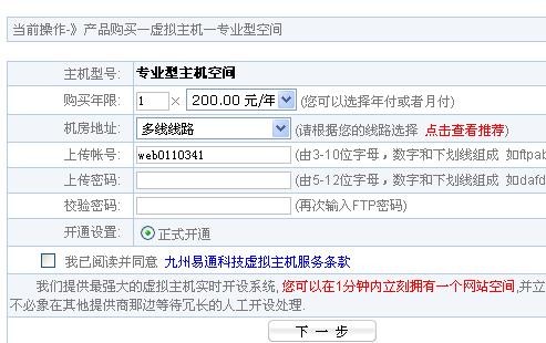 選擇“產(chǎn)品購買”欄目,在右側(cè)選擇“虛擬主機(jī)”進(jìn)入,挑選心儀的主機(jī)型號,點(diǎn)擊”立即購買”,進(jìn)入如下界面: