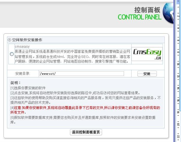 點(diǎn)選“易通企業(yè)網(wǎng)站系統(tǒng)是易通科技開發(fā)的中國首套免費(fèi)提供模板”后,直接按“安裝”按鈕,開始安裝。