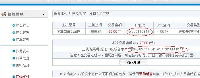 請記住FTP帳號:web0110341,及網(wǎng)站贈送的2級域名:http://web0110341.w84.cmseasy.net,以備后用;