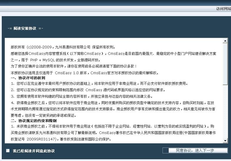 點(diǎn)擊“確定”,并新開IE窗口,在地址欄輸入易通網(wǎng)站提供的2級域名及install/,例如http://web0110341.w84.cmseasy.net/install/。